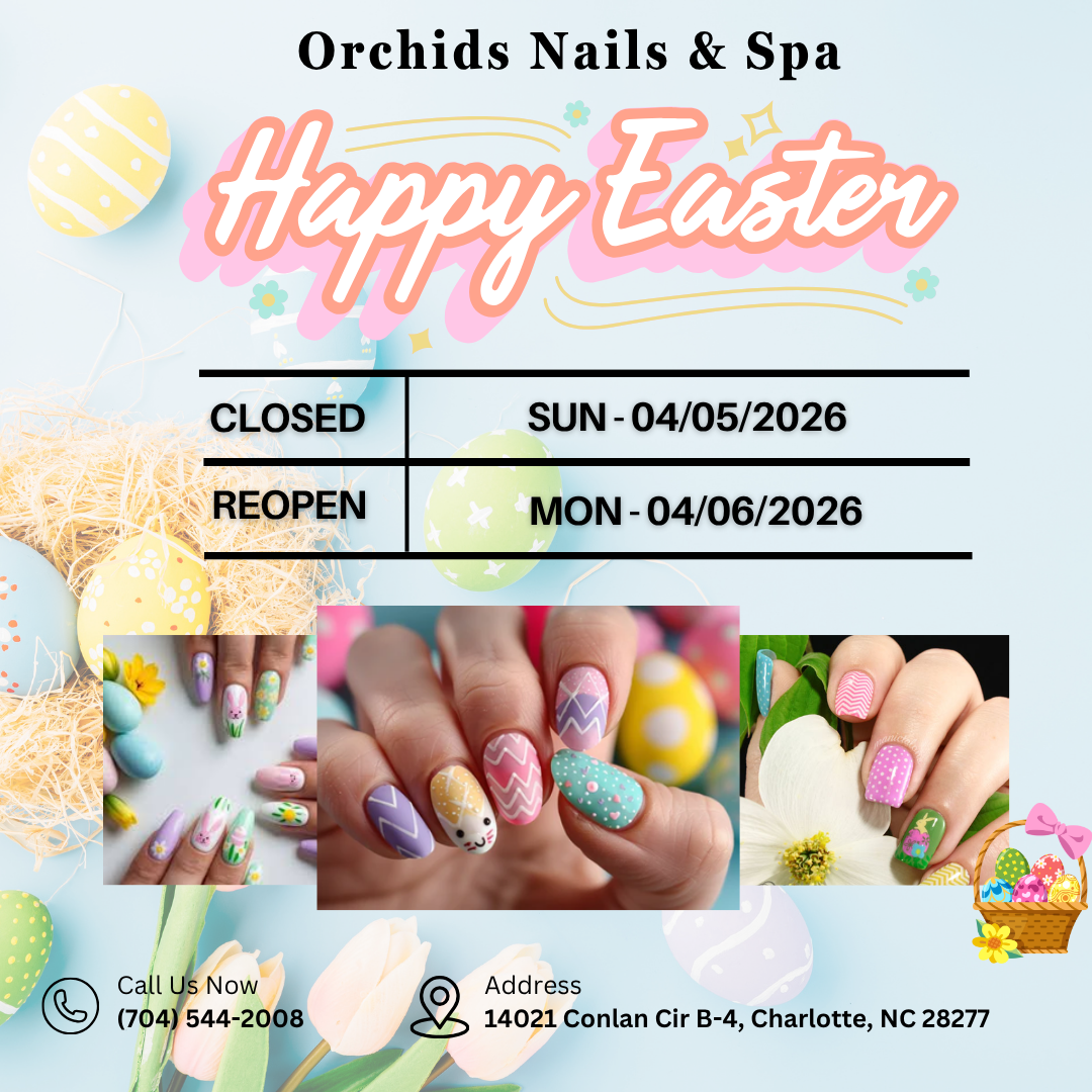 At Orchids Nails & Spa ! We are a team of qualified and experienced nail technicians with a talent for nail and beauty care. Located at 14021 Conlan Cir B-4, Charlotte, NC 28277. You can find us easily and get your nail care services done perfectly and without much hassle. Make your appointment with us at (704)544-2008 and pamper your body to a relaxing spa day! We hope to see you soon!